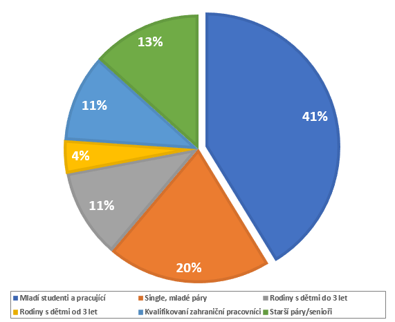 Podle kvalifikovaného odhadu2 analytického oddělení skupiny JRD odpovídá současná velikost poptávky po nájemním bydlení na pražském trhu až ¼ počtu obyvatel metropole: zájem o něj tedy má až 340 830 lidí. Nejpočetnější skupinu z nich tvoří mladí lidé v studentském věku (41 %)3, menší zastoupení pak mají singles a mladé páry (20 %), rodiny s dětmi (15 %), starší páry s dospělými potomky (13 %) a kvalifikovaní zahraniční pracovníci (11 %). Jednotlivé skupiny se stále rozrůstají (nyní i kvůli přílivu ukrajinských uprchlíků), ale trh se zatím nedokázal přizpůsobit jejich množství ani rozdílným požadavkům na poptávané typy nájemních nemovitostí. Velcí investoři v nájemním segmentu primárně cílí na studenty, singles a mladé páry a realizují projekty s vysokým podílem malometrážních bytů, které jsou určené spíše ke krátkodobému bydlení.